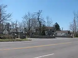 Today, Main Street is a four-lane road running east–west through Snyder connecting Williamsville (the other side of Interstate 290, known as the Youngman Expressway) to points westward such as the neighboring hamlet of Eggertsville and downtown Buffalo. The entranceway is located proximate to large residential areas of trees and grass, 1920s-built subdivisions flanking a wide central median.[2] It is situated three blocks east of Harlem Road (New York State Route 240). Across Main Street and northeast from the Entranceway is the Eggertsville-Snyder Branch Library of the Buffalo & Erie County Public Library located at 4622 Main Street.[5][6] Each side of the median serves one-way traffic. The entranceways sit on the two south side corners of this T-junction intersection.[2]