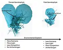 Moss gametophytes can be either asexual, female, male, or hermaphroditic like ferns. Unlike homosporous ferns, moss gametophytes can be either monoicous or dioicous (similar to monoecious and dioecious in vascular plants), with most studied dioicous species exhibiting genetic sex determination via the UV sex chromosome sex determination system. Some monoicous moss species such as Splachnum ampullaceum exhibit environmental sex determination during early development, with low light, low pH, and low nutrient availability all promoting male development.[22] In the presence of auxin, a widespread plant hormone, or gibberellins, compounds similar to Antheridiogen in ferns, both female and male individuals invest more in sexual structures (antheridia and archegonia).[23] Environmental sex determination in moss is fundamentally different from the spatial segregation of sexes, the occurrence of environmentally mediated sex ratios in moss patches, observed in sexually static moss species. Spatial segregation of the sexes in mosses is caused by differential survival rates between sexes as a result of the competitive advantage of female moss.[24][25] This leads to female dominated populations maintained by asexual reproduction and minimal sexual reproduction. In contrast, environmental sex determination is the dynamic development of females or males in different environmental conditions.