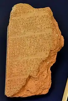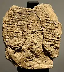 In the early 2000s, the Gilgamesh Dream Tablet was imported illegally into the United States. According to the United States Department of Justice, the tablet was encrusted with dirt and unreadable when it was purchased by a US antiquities dealer in 2003. The tablet was sold by an unnamed antiques dealer in 2007 with a letter falsely stating that it had been inside a box of ancient bronze fragments purchased in a 1981 auction.[16] In 2014, Hobby Lobby privately purchased the tablet for display at the Museum of the Bible in Washington, D.C.[16][17] In 2019, the Gilgamesh Dream Tablet was seized by US officials and was returned to Iraq in September 2021.[18][19]