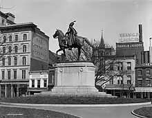 The statue was originally on a triangular park, Reservation 33, but was moved to another triangular park, Reservation 32, in 1931. It was moved back to its original location in 1958. The two reservations were merged in 1980 when Freedom Plaza opened.[9][10]