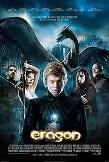 Eragon was in release for 17 weeks in the US, opening on December 15, 2006 and closing on April 8, 2007.[2] It opened in 3020 theaters, earning $8.7 million on opening day and $23.2 million across opening weekend, ranked 2nd behind The Pursuit of Happyness.[30] Eragon's second weekend US box office dropped by almost 70%, possibly due to the opening of Night at the Museum, another family film from 20th Century Fox,[31] the 41st biggest second weekend drop since this statistic was kept.[32] Eragon's $75 million total US gross was the 31st highest for 2006.[33]