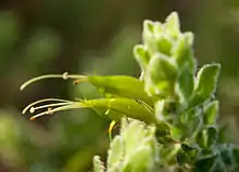Eremophila includes entomophilous species, with flowers adapted to attract insects, and ornithophilous species, with flowers that attract birds. Entomophilous flowers have protruding lower lips, which provide a landing area for insects, and they are often blue, purple, or white. Bird-adapted flowers are red, orange, yellow, or green, and have lobes pointing downwards which discourages insects. Bird pollinated species also tend to have longer stamens, which brush pollen onto and off the bird's head as it feeds.[5] The fruits are eaten by emus, which disperse the seeds in their droppings[5] although the belief that this aids in the germination of the seeds is mistaken.[4]