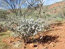 This eremophila features soft grey foliage and showy flowers but is frost sensitive and will not tolerate humidity. It has been propagated by grafting onto Myoporum and grown in well-drained soil in a sunny position.[8]