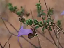 Eremophila flabellata is a flowering plant in the figwort family, Scrophulariaceae and is endemic to Western Australia. It is a small shrub with serrated leaves, broad serrated sepals and pink, purple or mauve flowers.