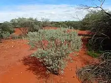 Shark Bay poverty bush is common between Shark Bay and Carnarvon, often growing on coastal sand dunes but grows inland as far as the Kennedy Range in the Carnarvon, Gascoyne, Geraldton Sandplains, Murchison and Yalgoo biogeographic regions.[6]