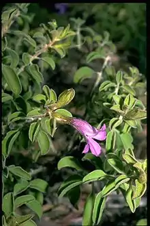 The flowers are borne singly in leaf axils on a stalk less than 2 mm (0.08 in) long. There are 5 green, hairy, lance-shaped or triangular sepals which are mostly 8.5–10.5 mm (0.3–0.4 in) long. The petals are 18–30 mm (0.7–1 in) long and joined at their lower end to form a tube. The petal tube is lilac-coloured or purple on the outside and white with lilac spots inside. The outside of the petal tube and the lobes are hairy but the inside surface of the lobes is glabrous and the inside of the tube is filled with woolly hairs. The 4 stamens are fully enclosed in the petal tube. Flowering occurs mainly from winter to spring and is followed by fruits which are oval-shaped, 4.5–7 mm (0.2–0.3 in) long and hairy.[2][3]