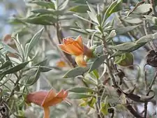The flowers are red to yellow, lack spots and are arranged singly in the leaf axils on a stalk which is 10–16 millimetres (0.4–0.6 in) long. There are 5 sepals which are narrow egg-shaped to triangular and of approximately equal lengths. The petals, which give the flowers their colour are 14–24 millimetres (0.6–0.9 in) long and joined in a tube with 5 lobes at the end. As with the leaves, the sepals and petals have a dusty covering of short, fine hairs. Flowering occurs between June and September and is followed by fruits which are flattened and dry with papery wings.[2][3][4]