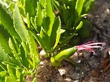 Eremophila serpens is a prostrate shrub which often has long, snake-like branches which have short side-branches. It forms patches 3 to 4 cm (1 to 2 in) high and up to 2.5 m (8 ft) wide. The branches are glabrous and contact the ground along most of their length, often forming roots. The leaves are arranged alternately along the branches and are lance-shaped, often have small, irregular serrations, and are mostly 31–47 mm (1–2 in) long and 8–12 mm (0.3–0.5 in) wide.[2][3][4][5]