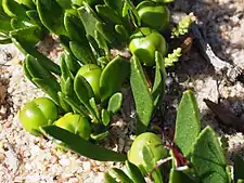 The flowers are borne singly or in pairs in leaf axils on stalks mostly 4–7 mm (0.2–0.3 in) long but are mostly or partly hidden by the leaves. There are 5 green, overlapping, egg-shaped to lance-shaped sepals which are 6–7 mm (0.2–0.3 in) long but enlarge to 10–11 mm (0.39–0.43 in) long after flowering. The petals are 15–26 mm (0.6–1 in) long and are joined at their lower end to form a tube. The petal tube is lime-green or yellowish-green, with red or brownish purple markings on the top lobe. The petal tube and its lobes are glabrous apart from some hairs on the lowest lobe and inside the tube. The 4 stamens extend beyond the end of the petal tube and are the most conspicuous part of the flowers. Flowering mainly occurs between March and December and is followed by fruits which are dry, almost spherical, 6.5–10 mm (0.3–0.4 in) long with a grey, papery covering.[2][3][5]