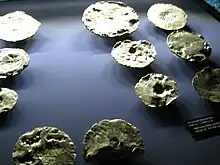 Besides the coins, the majority of individual pieces are accounted for by garment appliques and belt adornments (totaling 600 pieces).[2] Dozens of garment appliques are an extremely unusual find. These are small, silver sequins in various shapes, intended to be sewn onto garments. They were at the height of fashion in the 14th century, but, because they were made of solid silver, when the fashion changed all were melted down. The few surviving examples are almost all part of ecclesiastical textiles owned by churches. Erfurt provides rare evidence of the use of such ornaments in secular clothing.