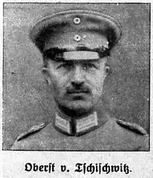 After completing his cadet training, Tschischwitz joined the Grenadier Regiment "Graf Kleist von Nollendorf" (1st West Prussian) No. 6 of the Imperial German Army on 22 March 1889, as a second lieutenant.[3][4] Tschischwitz was stationed at the cadet house at Bensberg from 1882 to 1885 before being transferred to the main institution at Lichterfelde.[4] He was promoted to first lieutenant on 1 September 1896, and on 22 March 1902, promoted to captain.[4] On 9 October 1902 he married Margarete von Steinbach and on 1 October 1904 he commanded the XV Corps at Strasbourg. On 1 April 1905 he returned to the General Staff and on 1 April 1906 he was appointed chief of the 1st company of the 4th Thuringian Infantry Regiment No. 72 in Torgau.[4] On 1 October 1907 he returned to the General Staff and simultaneously with his promotion to Major, on 10 September 1908, he took over as commander of the II Battalion in the 4th Silesian Infantry Regiment No. 157 in Brieg.[4][1]