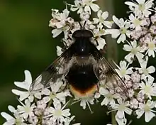 Eriozona syrphoides is a European species of hoverfly.[1] A large, bee mimic The thorax has black hairs in the middle and yellow or reddish hairs on the front and hind margins. The scutellum is white to yellow with yellow hairs. The abdomen has white hairs in front, black in the middle and has red hairs at the tip. The wing has a dark patch.[2] [3] [4] The habitat is Picea, Abies forest.[5] It is arboreal descending to feed on white umbellifers, Centaurea, Cirsium, Crataegus, Epilobium, Hypericum, Ranunculus, Sambucus nigra, Sorbus aucuparia, Succisa, Valeriana.[6] It ranges from Fennoscandia south to France (Vosges, Alps, Pyrenees) and from Ireland eastwards through Central Europe and northern Italy into European Russia and the Russian Far East and on through Siberia to the Pacific coast.[7][8][9] The larva feeds on aphids.