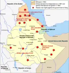 In 2006 the Ethiopian Government deployed its forces in its neighbour country Somalia, backing the government by fighting against the Islamists. The Ethiopian and Somali governments, accuses Eritrea for backing the Islamists in the region, in reaction of the Somali Government it started backing the Eritrean rebels.[82] In April 2007 Ethiopia accuses also Eritrea for supporting the rebel groups like the Ogaden National Liberation Front (ONLF) and the Afar Revolutionary Democratic Unity Front (ARDUF). In April 2011 Ethiopia openly declared its support for Eritrean rebel groups.[67] According to the Global Security in 2014 the rebel group Tigray People's Democratic Movement (TPDM) which is active in the Tigray Region was the most important rebel group in Eritrea fighting against the Ethiopian Government, Eritrea also financed and train the group.[83]