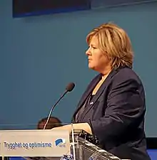 Solberg was first elected to the Storting in 1989, and served as Minister of Local Government and Regional Development in Bondevik's Second Cabinet from 2001 to 2005. During her tenure, she oversaw the tightening of immigration policy and the preparation of a proposed reform of the administrative divisions of Norway.[3] After the 2005 election, she chaired the Conservative Party parliamentary group until 2013. Solberg has emphasized the social and ideological basis of Conservative policies, though the party also has become visibly more pragmatic.[4]
