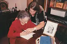 Her mentor, Juan Ramón Jiménez, worked as a cultural attaché at the Spanish embassy in the United States, and other members of the group of 27 also went into exile to America, such as was the case of Emilio Prados and Luis Cernuda.[4] During all the changes, their life was not easy. The couple had no children, and they endured their separation from their roots very differently. Ernestina's husband, Juan José Domenchina, did not adapt to her new life as an exile, and died prematurely in 1959;[5] she, for her part, came to have strong feelings of union with this new "homeland".[4] During this time her work took on a hitherto unexplored mysticism, and in 1952 she asked to join Opus Dei.[4][9] During this time she wrote Hai-kais espirituales (1967), Cartas cerradas (1968) and Poemas del ser y del estar (1972).