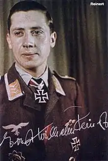 On 3 October 1942, Reinert passed the century mark with four claims. He was the 27th Luftwaffe pilot to achieve the century mark.[19] That day, the Rotte, a pair of aircraft, Reinert and his wingman Unteroffizier Rudolf Flindt had been ordered to fly from Stary Oskol to Kursk with the plan to intercept the daily Soviet reconnaissance aircraft. During the takeoff, the German airfield came under attack by a flight of Soviet Il-2 ground-attack aircraft escorted by Mikoyan-Gurevich MiG-3 and Lavochkin-Gorbunov-Gudkov LaGG-3 fighter aircraft. Reinert shot down two Il-2s before his 20 mm MG 151/20 cannon jammed. This forced him to continue the fight with only his two MG 131 machine guns operationally. Reinert managed to shoot down two further aircraft, two MiG-3s claimed at 14:17 and 14:20. In this encounter, Flindt was credited with two aerial victories.[20] At the time, Reinert was also credited with the destruction of 14 aircraft on the ground in addition to the 103 aerial victories. On 6 October, he was awarded the Knight's Cross of the Iron Cross with Oak Leaves (Ritterkreuz des Eisernen Kreuzes mit Eichenlaub). Reinert, together with Alfred Druschel, Johannes Steinhoff, Günther Rall and Max Stotz received the Oak Leaves from Adolf Hitler personally on 4 November 1942.[13] A flying ace or fighter ace is a military aviator credited with shooting down five or more enemy aircraft during aerial combat.[21] Reinert was only the second Feldwebel in the Luftwaffe to receive the award, after Gerhard Köppen.[15]