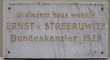 Streeruwitz did not stand for election to the National Council again; his tenure as a legislator thus ended with the 1930 legislative elections.[41] Nevertheless, Streeruwitz remained politically active. He traveled, lectured, and campaigned for the integration of Austria into the German Reich. He also continued to hold political office. In 1927, Streeruwitz had been elected deputy chairman of the Chamber of Commerce (German: Handelskammer). In 1930, he was elected the chamber's chairman proper.[42]