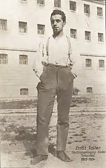 The noted authors Max Weber and Thomas Mann testified on Toller's behalf when he was tried for his part in the revolution. He was sentenced to five years in prison and served his sentence in the prisons of Stadelheim, Neuburg, Eichstätt. From February 1920 until his release, he was in the fortress of Niederschönenfeld, where he spent 149 days in solitary confinement and 24 days on hunger strike.[8]
