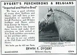 Erwin F. Dygert (August 18, 1894 – August 5, 1962) [1] was an importer of horses into the United States. He brought the last Belgian horses out of Europe before World War II prevented any more exports.[2]