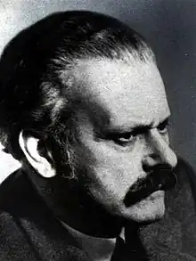 A Volksdeutscher from the Hungarian part of the Austro-Hungarian Empire, he attended school in Budapest before furthering his education in Karlsbad and Vienna.[2] Kolbenheyer studied philosophy, psychology and zoology at the University of Vienna and earned his PhD in 1905. He became a freelance writer and came to specialise in historical novels that were characterised by their fixation with all things German.[2] In 1908 he published Amor Dei, a novel about life and thinking of the Jewish-Dutch philosopher Baruch Spinoza, which made Kolbenheyer fairly known. Kolbenheyer published an anthology with own poetry under the title Der Dornbusch brennt (i.e. Burning bush) in 1922. Between 1917 and 1925 he produced his most celebrated works, a trilogy of novels about Paracelsus, and in these books Kolbenheyer explored many of the Völkisch movement concepts prevalent at the time by presenting his hero as the Nordic race archetype struggling against racial degeneracy and immorality.[3] In 1929 he published „Heroische Leidenschaften“ (i.e. Heroic Passions), a drama about the Italian astronomer Giordano Bruno. Having settled amongst the Sudeten Germans, Kolbenheyer's right-wing attitudes solidified and he came to pre-empt many ideas of Nazism, notably in his theoretical work Die Bauhütte (1925), which predicted a turn away from 'Judeo-Christianity' as the source of German salvation.[2] This work has been identified as being one of the main influences on Alfred Rosenberg's The Myth of the Twentieth Century.[4] In Kolbenheyer's own words the addressee of his book "Bauhütte" is the "philosophical conscience ... of the white race" which he wanted to arouse.[5] A strong opponent of left-wing politics, he joined Wilhelm Schäfer in resigning from the Akademie der Künste in 1931 over what he saw as their support for the activities of Heinrich Mann and Alfred Döblin.[6]