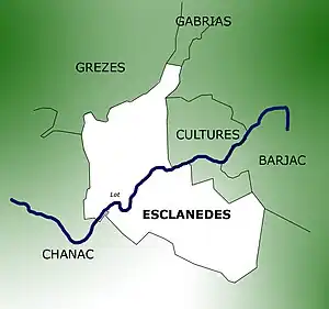The main part of the commune is located in the Lot valley, whereas the rest is on the Causse of Sauveterre. The town hall is located in the biggest burg called Le Bruel, on the north side of the river. Esclanèdes is named after the burg situated on the north side and where is located the church. Other inhabited places are the small burgs of Les Crottes et la Rocherousse and the two farms of Marance and Le Mazet.