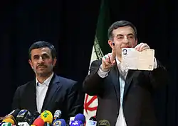 - ↑ "Ahmadinejad protege vows comeback". Associated Press. 2 July 2013. Retrieved 27 August 2013.