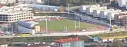 Built in 1972[6] and renovated in 2007, its playing surface is artificial grass[7] and the covered grandstand has 500 seats.[8] The athletics track is homologated for every official competition.