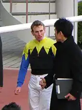 Racing colours of Queen Elizabeth II, as used by her father King George VI and great-grandfather King Edward VII: Purple, gold braid, scarlet sleeves, black velvet cap, gold fringe[1]