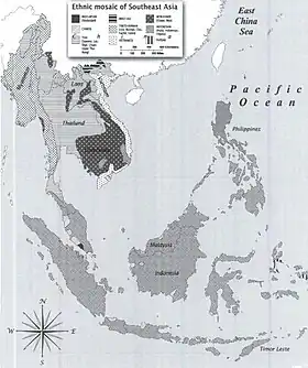The ethnic groups of Southeast Asia comprise many different ethnolinguistic stocks. Besides indigenous Southeast Asians, many East Asians and South Asians call Southeast Asia their home. The total Southeast Asian population stands at 655 million (2019).[1][2]