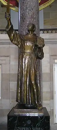 Arriving in the United States in 1915, Cadorin first settled in New York City, securing a position as a lecturer in Italian at Columbia University. In 1925 he relocated to California, where he remained for the rest of his life.[3] While living in California he was selected to produce his best known work in the United States, the 1930 bronze statue of Junipero Serra located in the National Statuary Hall Collection in the Capitol Building, Washington, D.C., one of the two statues representing his adopted home state. Also located in Washington are his three "large stone statues of the patron saints" located at the National Cathedral.[4] In the creation of these figures, Saint Peter, Saint Paul and Saint John, Cadorin was assisted by Marian Brackenridge, and they were carved by Italo Fanfani.[5]
