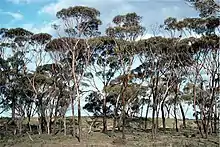 Found in open woodland areas where it occurs as part of the overstorey along with Eucalyptus longicornis, E. urna, E. sargentii and E. salmonophloia. Associated species found in the understorey include Melaleuca lateriflora, M. acuminata, M. thyoides, Rhagodia drummondii, Atriplex paludosa, Atriplex vesicaria, Rhagodia preissii, Templetonia sulcata, Acacia erinacea and Disphyma crassifolium.[8]