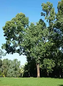 Eucalyptus raveretiana, commonly known as the black ironbox,[2] is a species of small to medium-sized tree that is endemic to Queensland. It has rough, fibrous or flaky bark on the trunk and larger branches, smooth pale grey bark above, lance-shaped leaves, flower buds in groups of seven on a branched peduncle, white flowers and small, hemispherical fruit.