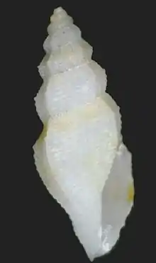 The ribs are rounded, narrower than the interspaces, surmounting the slight shoulder-angle and attaining the suture. The revolving striae are very fine and close. The color of the shell is white, with traces of brown staining.[2]