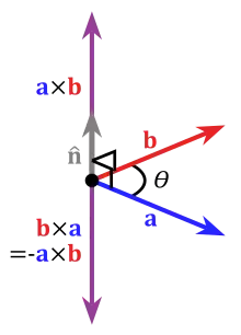 where θ is the measure of the angle between a and b, and n is a unit vector perpendicular to both a and b which completes a right-handed system. The right-handedness constraint is necessary because there exist two unit vectors that are perpendicular to both a and b, namely, n and (−n).