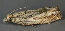 It is native to Europe.[1] The wingspan is 13–17 mm. The forewings have a few narrow, light slashes around the wing tip, at the tornus an oval, light spot with a single black longitudinal line. At the posterior edge there are more or less clear, bright (often grey) spots. The larva is pale brownish yellow.