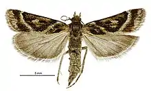 ♂. 19 mm. Head dark fuscous. Palpi 1+1⁄2, dark fuscous, lower longitudinal half ochreous-whitish. Antennae very minutely pubescent. Thorax dark fuscous, sprinkled with ferruginous scales. Forewings elongate, gradually dilated, costa almost straight, apex obtuse, termen faintly sinuate, rather oblique ; dark fuscous, irregularly strewn except on margins with yellowish-ferruginous scales, and partially suffused with black, especially about margins of first and second lines and towards dorsum anteriorly ; first and second lines represented by straight undefined series of whitish scales surrounded with yellowish-ferriiginous suffusion, strongly converging towards dorsum ; a small spot of white scales in middle of disc, followed by a black spot ; a well-marked black fascia beyond second line ; a few white scales indicating subterminal line : cilia ochreous-whitish, with dark-fuscous basal and grey median lines. Hindwings without hairs in cell ; dark grey sprinkled with blackish ; cilia ochreous-whitish, with dark-grey basal line.[4]