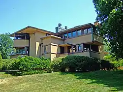 Around 1908, Eugene and Blanche hired Frank Lloyd Wright to design them a home after seeing some of his designs in an issue of the magazine Architectural Record.[4] By this time, Wright had been in the architectural design business for 20 years, starting as a draftsman completing designs for other architects in traditional styles, then becoming an independent architect and shifting from traditional styles to Prairie School.[5] When the Gilmores hired Wright, he was a leading proponent of Prairie Style, and his version was mature, producing modern-looking, strongly horizontal buildings that fit the American landscape like sandstone outcrops.[4]