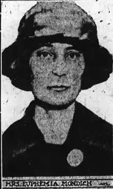 Euphemia Mondich (1884 – August 20, 1961), known as Lady Bluebeard, was a Polish–American bigamist, murderer and suspected serial killer who killed at least one husband and a lover in Detroit, Michigan, on two separate occasions in 1921. Convicted for the final murder, she was sentenced to life imprisonment and remained imprisoned until her death in 1961.