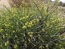 It grows to 60 or 70 cm in height, with a tuberous root-system that is often eaten by porcupines, and with thin (3-5mm), erect, grey, branching stems. The branches are dichotomous and taper to soft points.