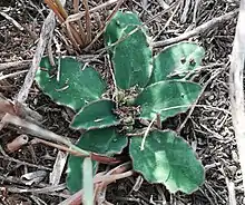It is dioecious and its yellow-green 5mm flowers (cyathia) appear over the Winter, on short (1–5 cm), trailing peduncles.[1] [2][3]