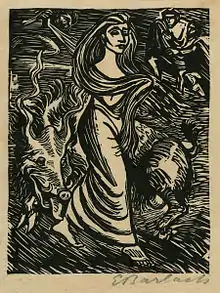 Another member of Der Blaue Reiter was Franz Marc, an artist who died prematurely in the world war. Particularly interested in the representation of animals, with which he symbolized communion with nature, he left sixty-three prints, made between 1908 and 1916.[31] Also worth mentioning is the sculptor Ernst Barlach, who was also an engraver and playwright. His graphic work spanned from 1910 to 1930, in lithography and woodcut: in the former technique he illustrated his own dramas (Der Tote Tag, 1912; Der arme Vetter, 1919), while in the latter he produced more stylized images (Der Kopf, 1919; Walpurgisnacht, 1923; Lied an die Freude, 1927).[32] In Austria, Oskar Kokoschka, an expressionist of personal inspiration, stood out, author of such lithographic series as Dreaming Children (1908), King Lear (1963), Odyssey (1963–1965), Saul and David (1966–1968) and Trojans (1971–1972).[33]