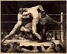 In the United States, the work of John French Sloan, a painter and engraver of the Ashcan school, a realist style trend characterized by its urban genre scenes, is also noteworthy. He preferably painted scenes of everyday life in New York, focusing mainly on the objective description, without critical or moral evaluations, although sometimes with a certain dramatic component. A good example is his etching Windows at Night (1910).[67] To the same school belonged George Wesley Bellows, author of urban scenes of New York, with a preference for images of boxing and baseball. He devoted himself to lithography, a technique in which he illustrated several books, especially by H. G. Wells.[68] Edward Hopper was a representative of the so-called American Realism or American Scene, with urban scenes of anonymous and lonely characters. In his early days he worked as an illustrator to make ends meet, a period that includes his series of etchings Night Shadows (1921) and Train and bathers (1930).[69]