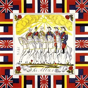 The interwar period saw the emergence in France of the so-called School of Paris, a heterodox group of artists linked to various artistic styles such as post-impressionism, expressionism, cubism and surrealism. The term encompasses a wide variety of artists, both French and foreign, who resided in the French capital in the interval between the two world wars.[63] In the graphic field, Russian-born Marc Chagall stood out, who developed a style denoting Fauvist and Cubist influences, although interpreted in a personal way, with a work of dreamlike tone and intense chromaticism. He began printmaking at the age of thirty-six, with the illustrations for Paul Cassirer's autobiography Mein Leben (1923), twenty-six etchings and drypoints. Already established in Paris, he carried out several commissions for the publisher Vollard: Les âmes mortes by Nikolai Gogol (1924–1925), Les Fables by La Fontaine (1926–1931), L'Ancien Testament (1931–1939). Exiled in the United States between 1941 and 1948, he produced here the lithographic series Four Tales from the Arabian Nights. Back in France, he produced several series of lithographs: Daphnis and Chloe (1961), Circus (1967), In the Land of the Gods (1967); as well as etchings, aquatints, monotypes and the woodcut series Poems (1968).[64] Also worth mentioning in this school are: Louis Jou, devoted himself to woodcuts intended for the illustration of books in luxury editions; André Dunoyer de Segonzac devoted himself to intaglio, in which he was a prolific author (1600 plates), his main work was the illustration of the Georgics of Virgil (1947); Luc-Albert Moreau excelled in lithography; in poster art, Paul Colin, Jean Carlou and Cassandre stood out, renewing and modernizing the genre.[65]