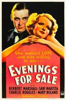 Evenings for Sale is a 1932 American pre-Code comedy film directed by Stuart Walker and written by S.K. Lauren, Agnes Brand Leahy and I. A. R. Wylie. The film stars Herbert Marshall, Sari Maritza, Charlie Ruggles, Mary Boland, George Barbier and Bert Roach. The film was released on November 12, 1932, by Paramount Pictures.[1][2]