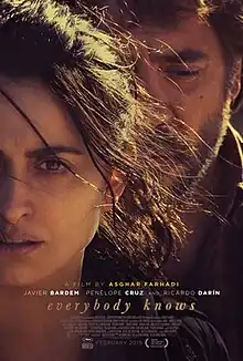 Everybody Knows (Spanish: Todos lo saben, lit. 'Everyone Knows It') is a 2018 Spanish-language mystery/crime drama film written and directed by Iranian filmmaker Asghar Farhadi, and starring Javier Bardem, Penélope Cruz and Ricardo Darín.[4][5] The film was selected to open the 2018 Cannes Film Festival in competition[6] and was released in Spain on 14 September 2018.[7] It was released in the United States on 8 February 2019.[8]