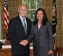 Ambassador Veiga with President Bush after presenting her credentials as ambassador, August 16, 2007