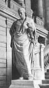 On the monumental gate of Berchem in Antwerp, Bouré's statue of the Belgo-gallic leader Ambiorix was paired with that of the Nervian general Boduognatus by Pierre Armand Cattier.[42] Their works were brought together again at the Palais de Justice in Brussels, where a pair of Bouré's griffins also preside over the portal. For the interior of the Palais, each artist provided a pair of larger-than-life figures, Cattier the Greek orators Demosthenes and Lycurgus, and Bouré the Roman jurists Cicero and Ulpian. These were among Bouré's last completed works.[43]