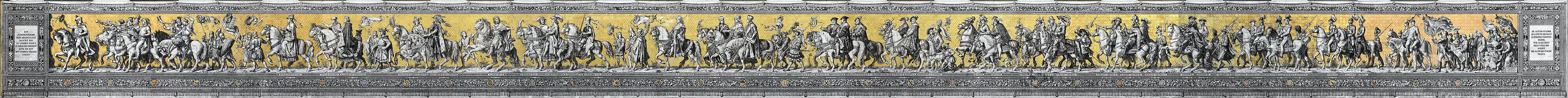 For the upcoming 800th anniversary of the House of Wettin in 1889, another stucco version of a large-scale mural was commissioned. It was painted by the artist Wilhelm Walther between 1871 and 1876. Since the picture rapidly deteriorated, it was replaced with about 23,000 Meissen porcelain tiles between 1904 and 1907.[3] The mural depicts the 35 Saxon margraves, electors, dukes and kings from Conrad, Margrave of Meissen, who ruled in the 12th century, to George of Saxony who was king for only two years in the 20th century. The only ones missing are Heinrich I von Eilenburg (c. 1089) and the last king of Saxony, Frederick Augustus III, who ruled from 1904 to 1918. Also shown are 59 scientists, artisans, craftsmen, children and farmers.[2]