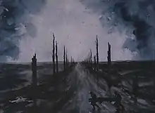 After the war, he was unfit for his previous work and living on a weekly disablement pension of 8s (equivalent to £22 in 2019).[7] With the encouragement of his wife, and despite having no formal art training,[7] he painted a number of scenes of battlefields at night, featuring silhouetted soldiers. He worked in pencil or ink and watercolour,[3] on paper, sometimes embellished with silver paint.[6]