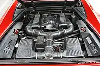Apart from the displacement increase from 3.4 L (3,405 cc) to 3.5 L (3,495 cc), the major difference between the V8 engine in the 348 and F355 is the introduction of a 5-valve cylinder head. This new head design allowed for better intake permeability and resulted in an engine that was considerably more powerful, generating a maximum power output 380 PS (279 kW; 375 hp) at 8,250 rpm and 363 N⋅m (268 lb⋅ft) of at 6,000 rpm.[3] The longitudinally mounted 90° V8 engine was stroked by 2 mm over the 348's engine (77 mm rather than 75 mm), resulting in the small increase in displacement. Engine internals are produced using lightweight materials; the connecting rods are forged in Ti6-Al-4V titanium alloy. The engine's compression ratio is 11:1 and employs the Bosch Motronic 2.7 engine control unit in the 1995 model year, later changed to the M5.2 in 1996 through end of production. The Motronic system controls the electronic fuel injection and ignition systems, with a single spark plug per cylinder. Engine lubrication is via a dry sump oiling system. The engine was designed by Paolo Martinelli.[4]